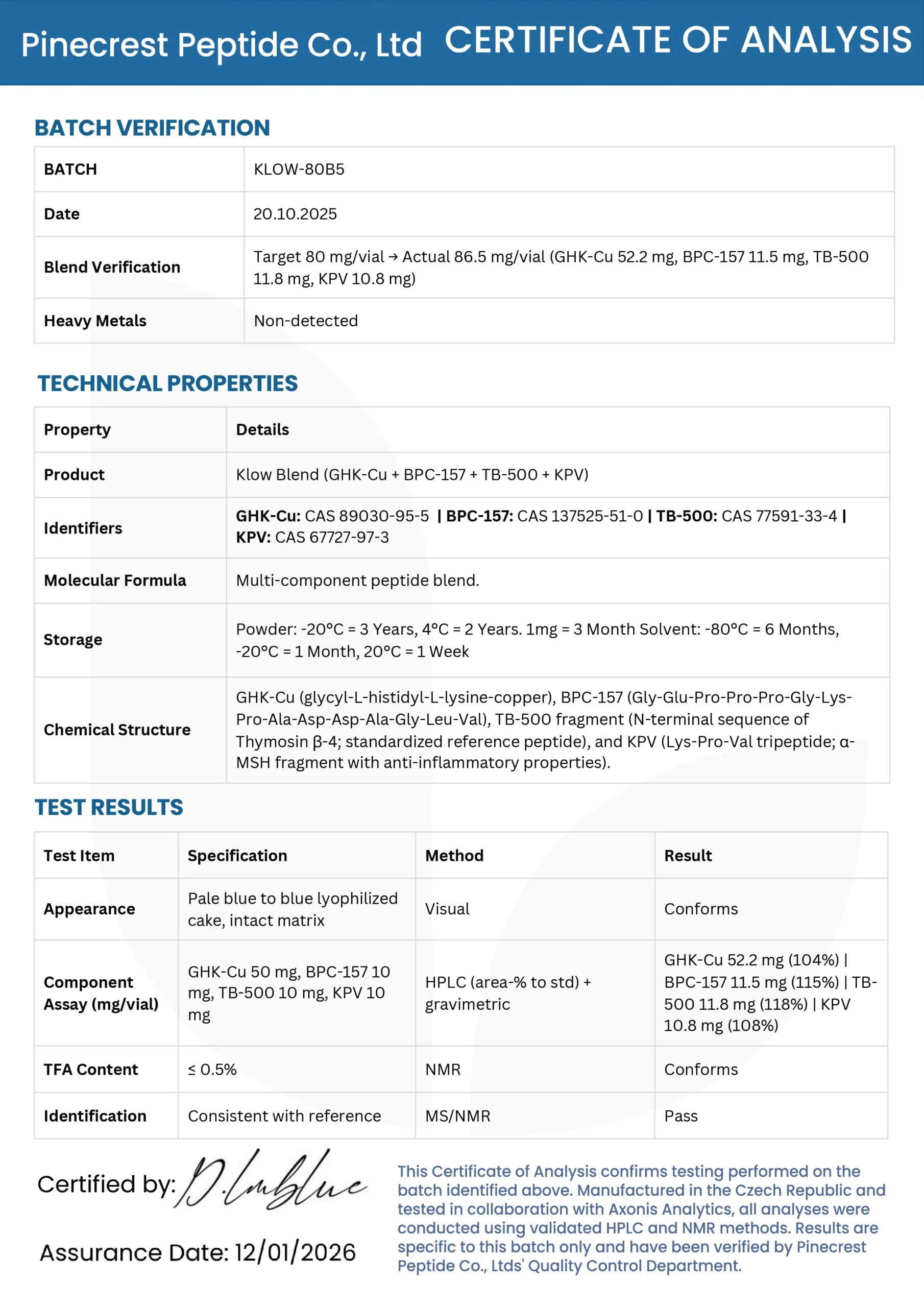 Batch-specific Certificate of Analysis for each component