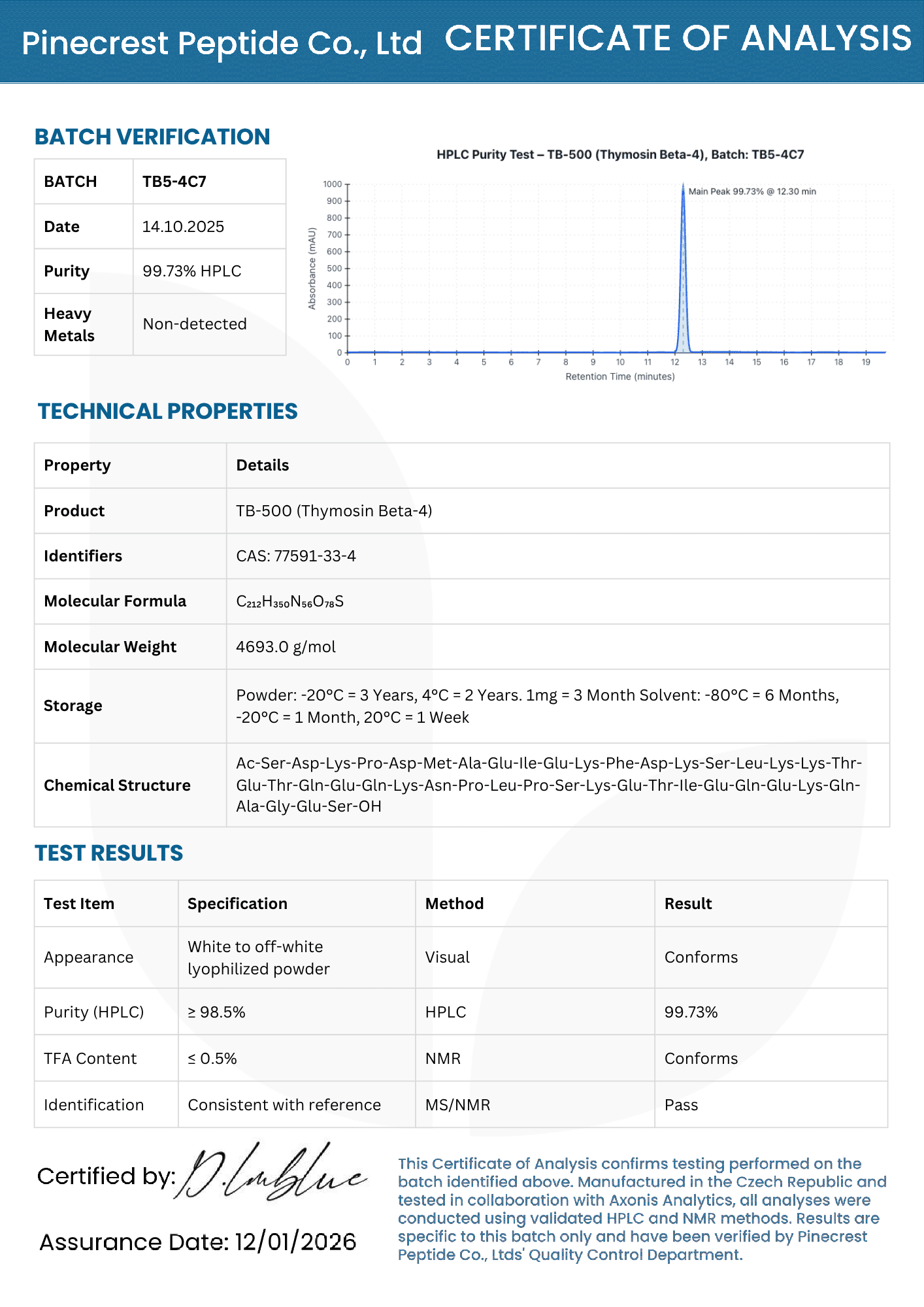 A: Research-grade TB-500 should be ≥98% purity by HPLC . Pinecrest’s TB-500 is ≥99% with full documentation, including HPLC chromatograms and MS confirmation.